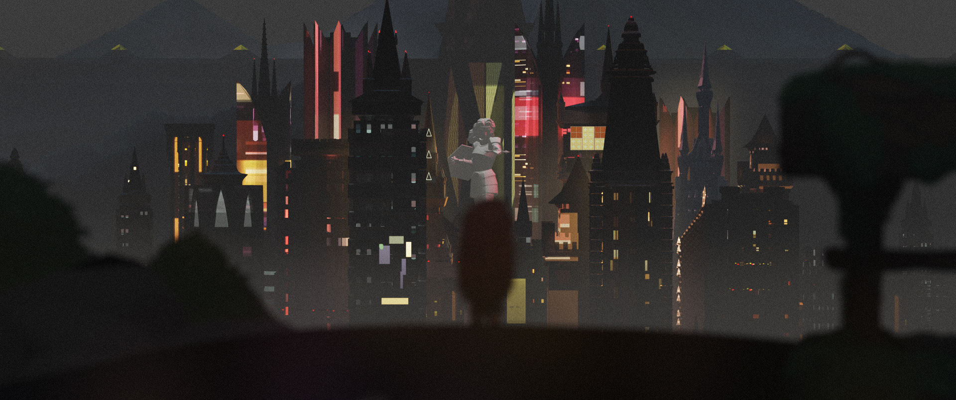 I created the cityscape, animated BG traffic, pine-covered hills, and sky using a mix of digital illustration, 3d modeling + texture, lighting, rendering, and compositing for this early, vision-defining piece